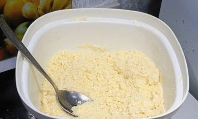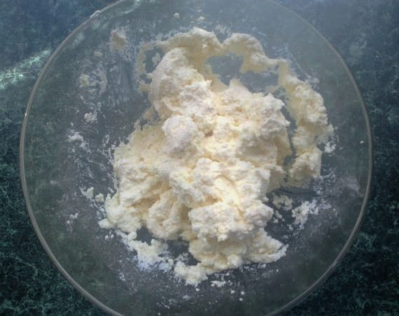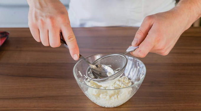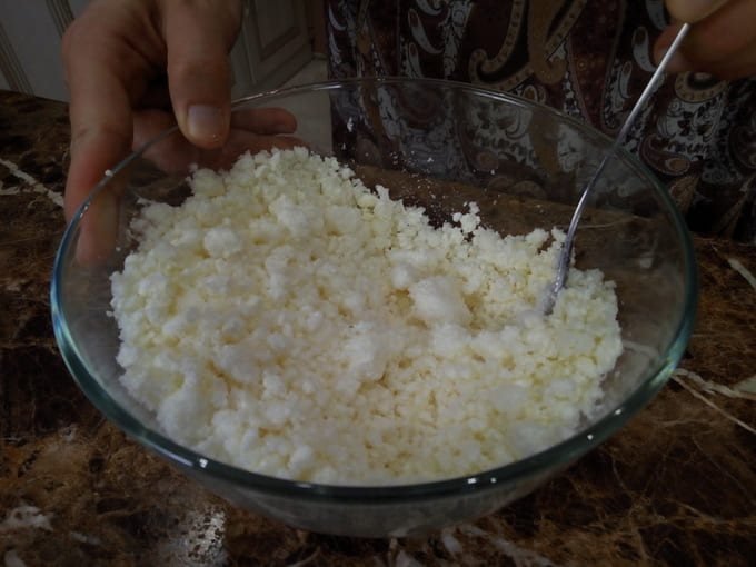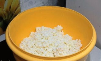 - Doe de benodigde hoeveelheid kwark in een grote kom. Het is beter om een zacht product te kiezen. De korrelige zal door een zeef moeten malen.