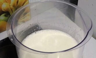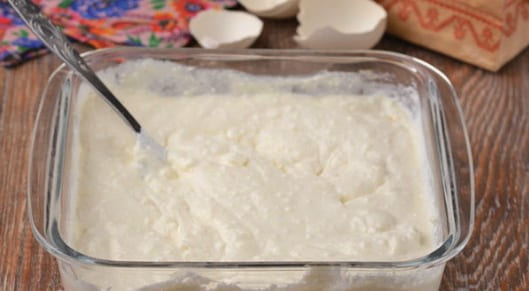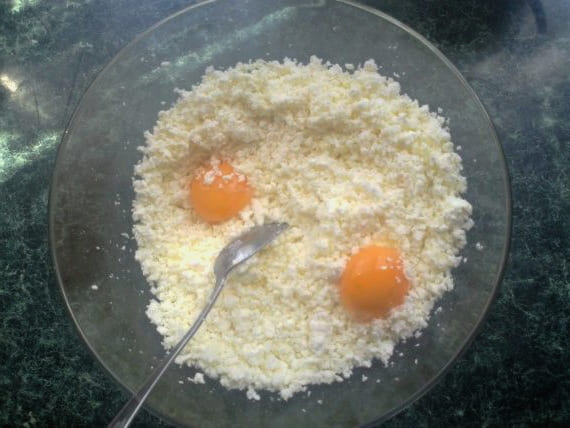 - Klop twee kippeneieren met suiker en combineer de massa met kwark. Grondig roeren.