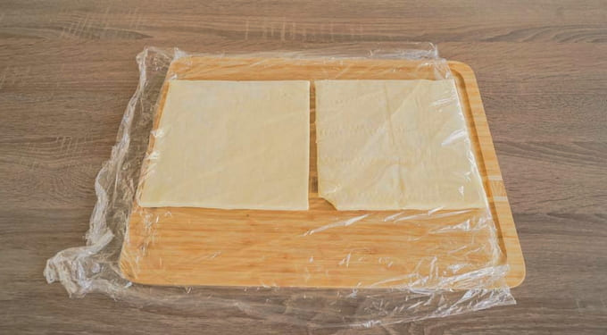 - Ontdooi het bladerdeeg. Leg het hiervoor op een vlakke ondergrond, dek het af met huishoudfolie en laat het op kamertemperatuur ontdooien.
