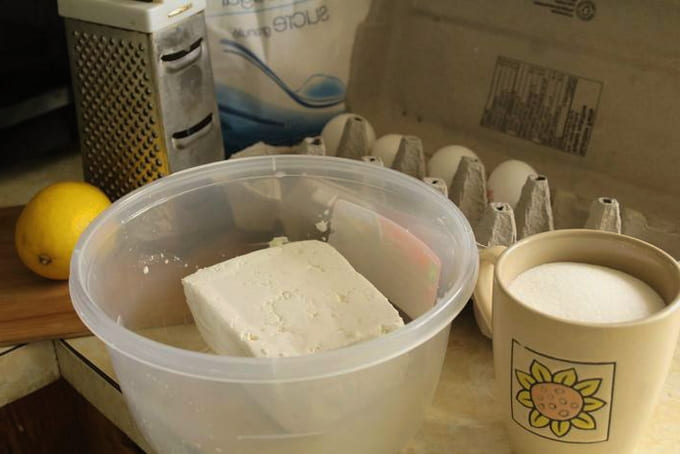 - Doe de kwark in een grote kom, voeg de halve suiker, vanille-essence, citroenschil en kippeneieren toe. Klop de massa grondig met een mixer of blender.
