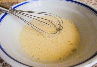 - Laten we het deeg maken. Breek de eieren in een diep bord en maal ze met suiker.