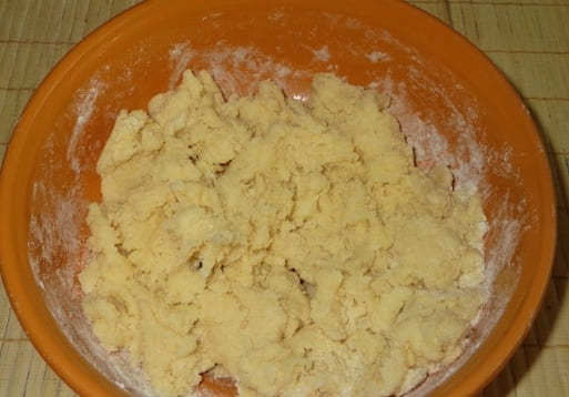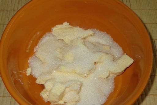 - We verspreiden een pakje boter en laten het ingrediënt een beetje zacht worden. Combineer het dan met bloem, suiker, zout en bakpoeder. Kneed het deeg met je handen tot je een fijne, homogene kruimel krijgt.