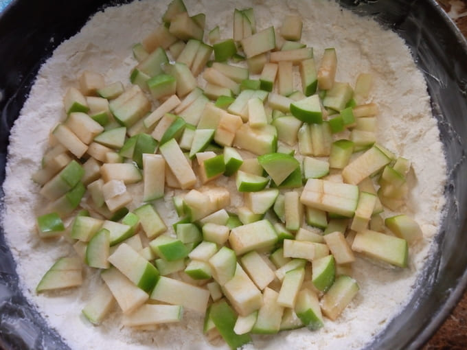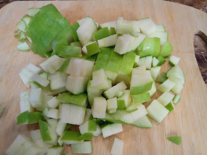 - Laten we beginnen met het maken van de vulling. Was de appels en snijd ze in kleine blokjes. We verwijderen voorzichtig de botten.