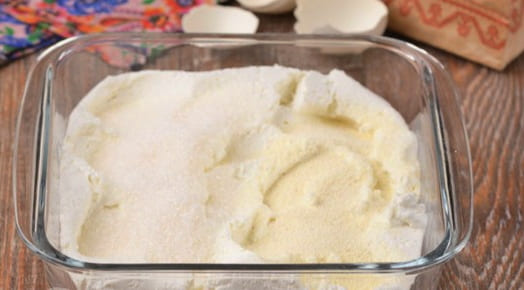 - Laten we beginnen met het bereiden van de wrongelvulling. Combineer kwark met eieren, griesmeel en suiker. Slaan tot dat het glad is.