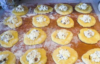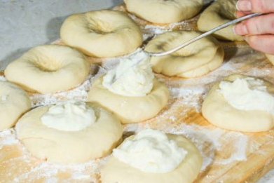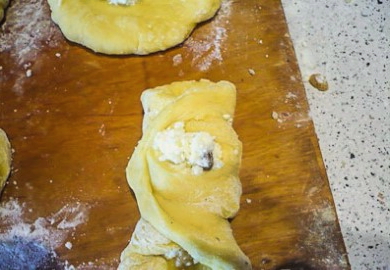 - Roer voor het deeg bloem met margarine, ei en suiker. Kneed het deeg, verdeel het in kleine gelijke cirkels en vul ze met wrongelvulling.