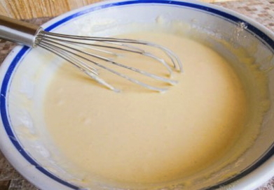 - Voeg bloem, zure room, gesmolten boter, soda en vanilline toe aan het eimengsel. Klop tot alle klontjes verdwenen zijn.