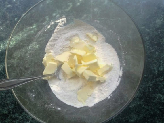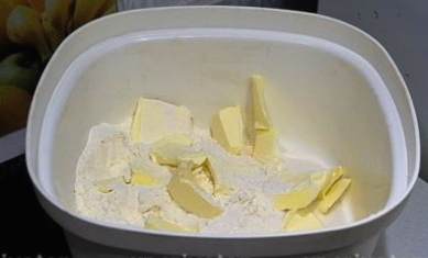 - Zeef voor het deeg de bloem met bakpoeder. We dompelen kleine stukjes boter in het droge product.