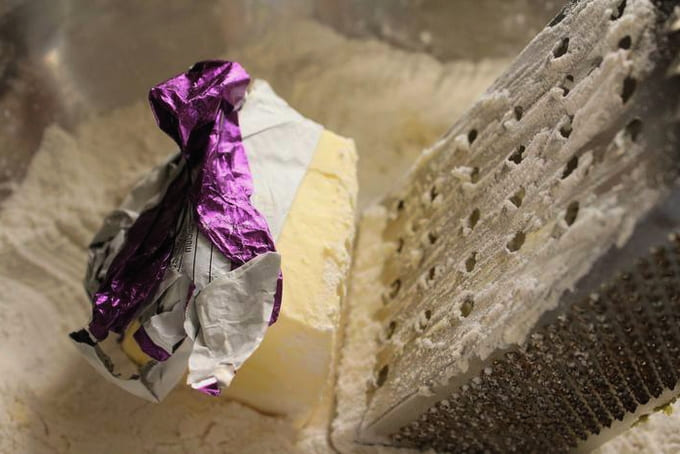 - Zeef de bloem met de resterende suiker in een aparte kom. Voeg boterschaafsel toe aan droge producten. Hiervoor moet het bevroren product op een grove rasp worden geraspt.