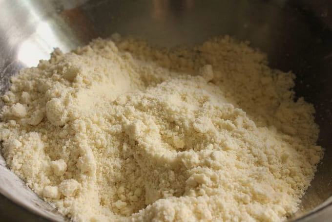 - Roer het deeg met je handen totdat het in kleine kruimels verandert.