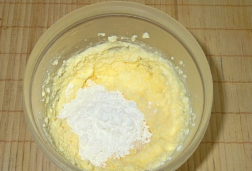 - Voeg zetmeel, soda, vanilline en zout toe aan het wrongelproduct. Roer opnieuw tot een gladde massa.