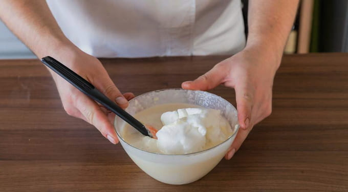 - Haal het eiwit uit de twee overgebleven eieren en klop ze tot ze dik en luchtig zijn. We laten de dooiers. We verspreiden het eiwitproduct in de wrongelmassa. Roer voorzichtig met een spatel.