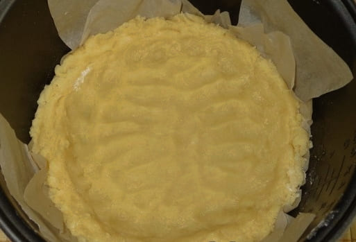 - We doen perkament in de kom van de multicooker. We leggen er bloem, boter en suikerdeeg op in een dichte laag.