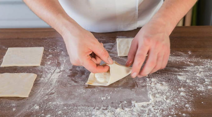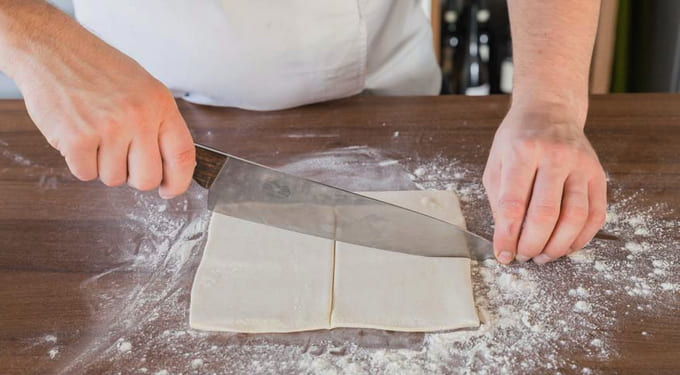 - Snijd het ontdooide deeg in vierkanten van gelijke grootte.
