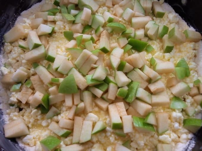 - Schep de helft van de wrongelmassa erop en verdeel de appelstukjes erover. Ook maar de helft.