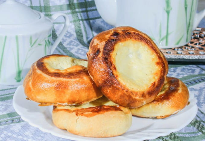 Een geweldig idee voor zelfgemaakte thee - delicate kwarktaarten. Maak een gistdeegschotel. Het product zal rossig, zacht en met een verbazingwekkend helder aroma uitkomen.