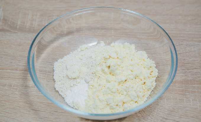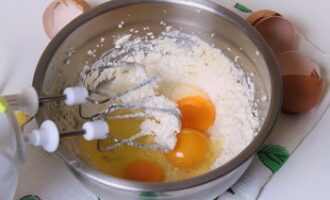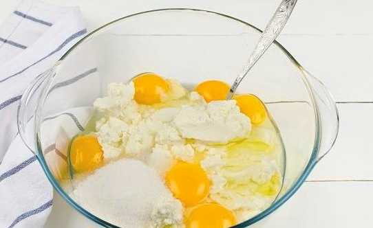 - Doe de kwark in een diep bord. Als het groot is, moet je het eerst malen. We breken hier ook eieren, voegen twee soorten suiker en zout toe.