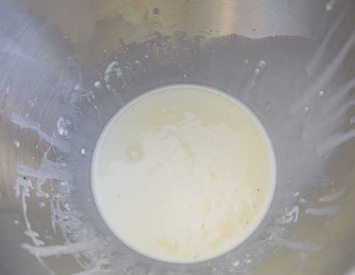 - Giet melk op kamertemperatuur bij de botermassa.
