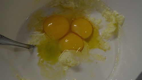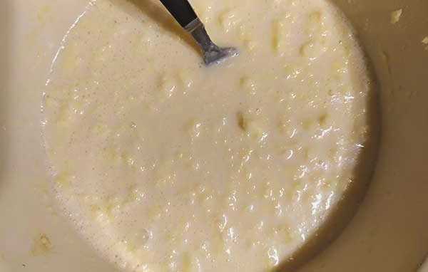 - Giet melk op kamertemperatuur bij de massa en breek de eieren. Slaan tot dat het glad is.