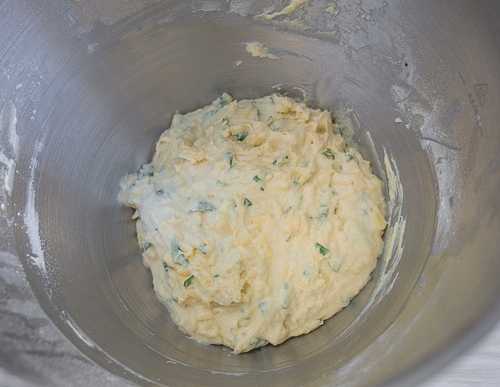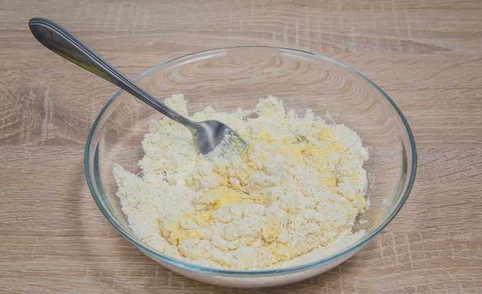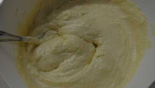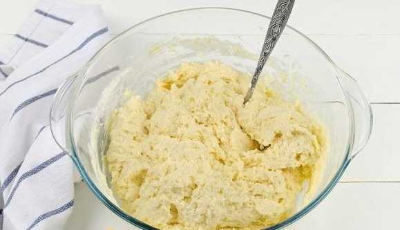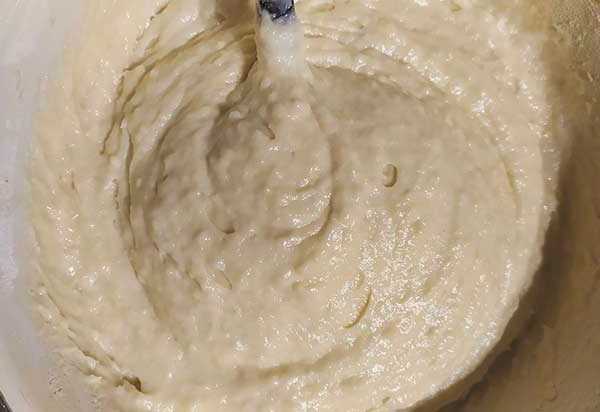 - Roer de massa met een lepel tot een gladde massa. Het deeg moet zacht en plakkerig zijn.