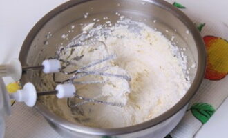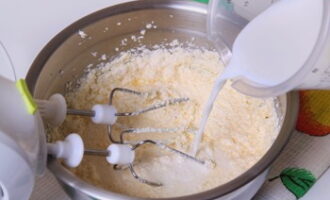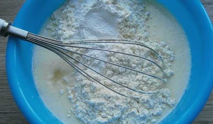 - We halen kefir van tevoren uit de koelkast en gieten het bij het eiermengsel als het op kamertemperatuur is. Zeef de bloem onmiddellijk met bakpoeder.