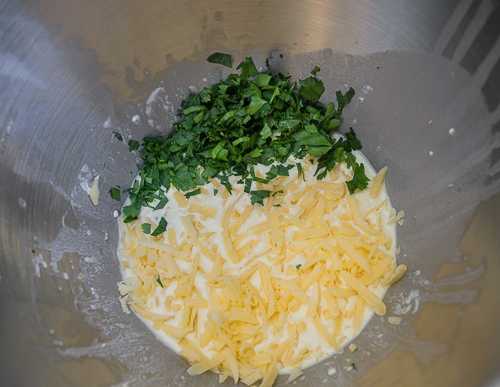 - We wrijven de kaas op een grove rasp, hakken de peterselie fijn. Gooi het voedsel in het opgeklopte vloeibare mengsel.