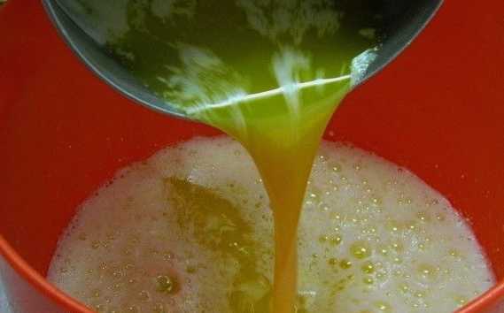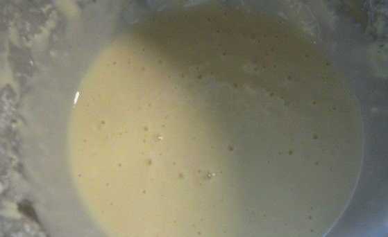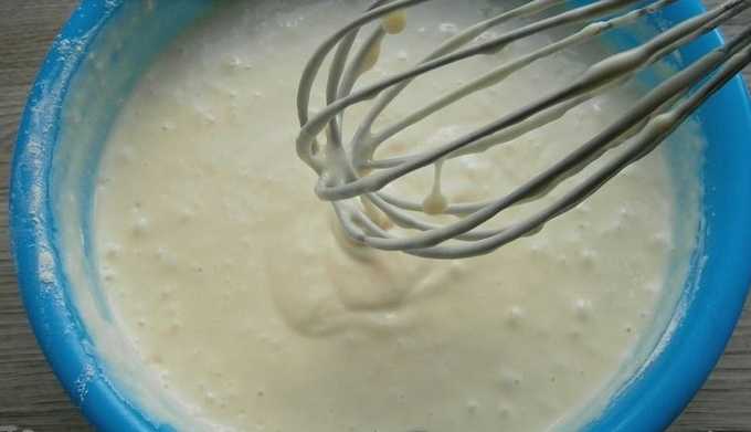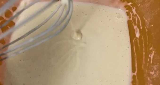 - Giet gesmolten boter in de massa en begin goed te kloppen. We krijgen een glad, stroperig deeg, zoals pannenkoeken.