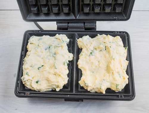 - Doe de inhoud in een wafelijzer en bak ongeveer 5 minuten tot een heldere, gelijkmatige blos.