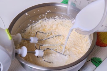 - Giet melk op kamertemperatuur bij de massa en breek de eieren. Slaan tot dat het glad is.