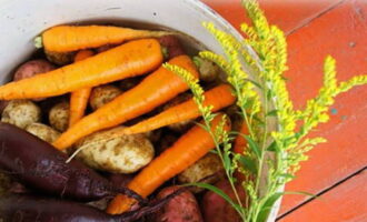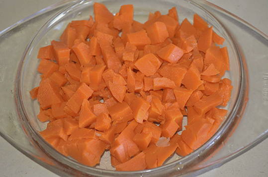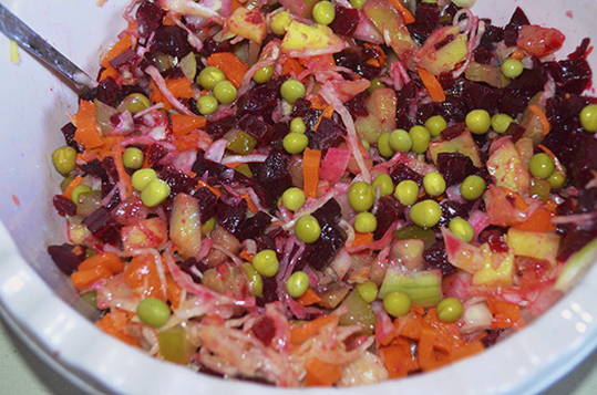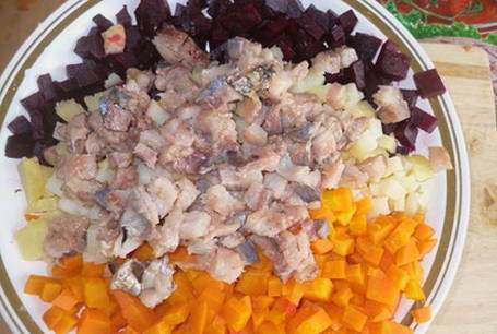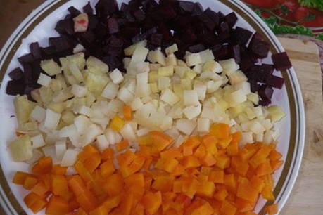 - Bieten, wortelen en aardappelen van tevoren koken, afkoelen en schillen. Giet het sap van de ingeblikte erwten af.