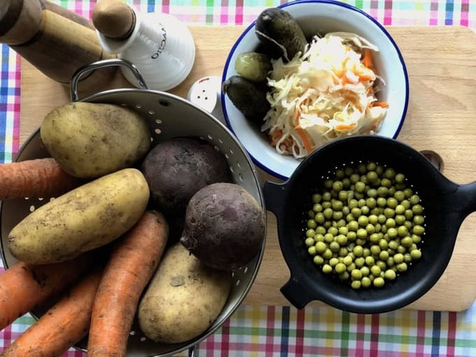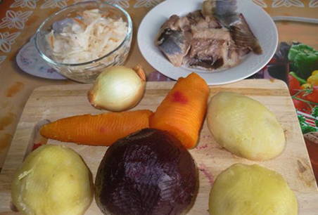- Schil de gekookte groenten, snijd de haring, pers de zuurkool uit de pekel.