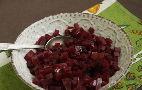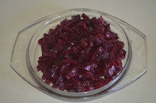 - Schil gekookte groenten. Snijd de bieten in middelgrote blokjes, doe ze in een kom, overgiet met plantaardige olie en roer.