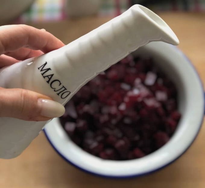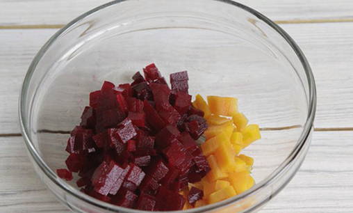 - Schil en snijd de bieten in blokjes, doe ze in een kom en breng op smaak met plantaardige olie.
