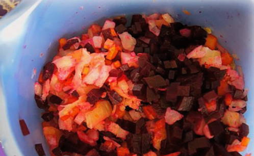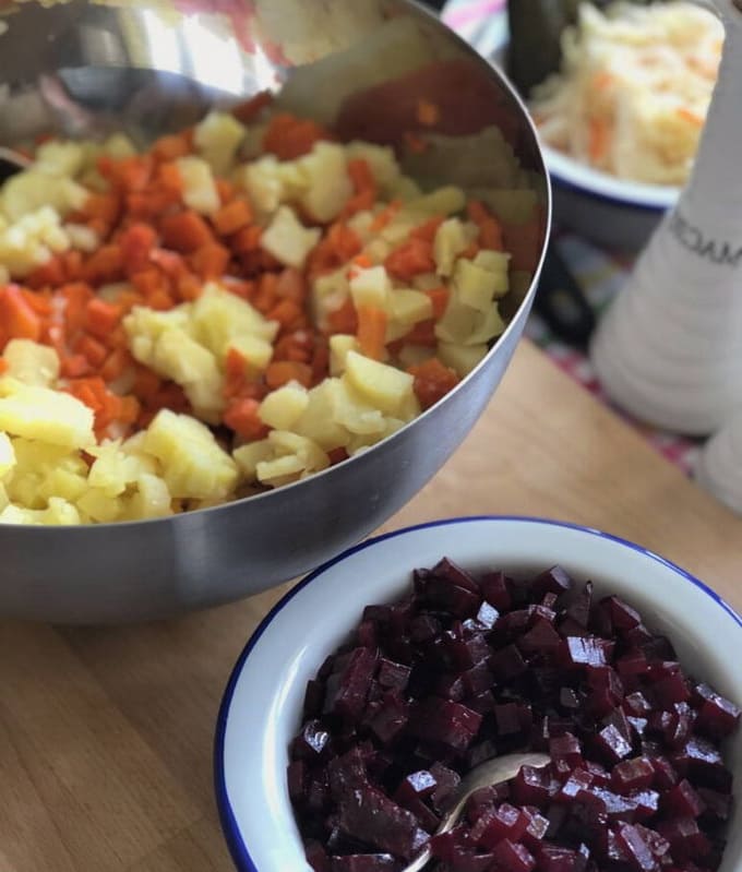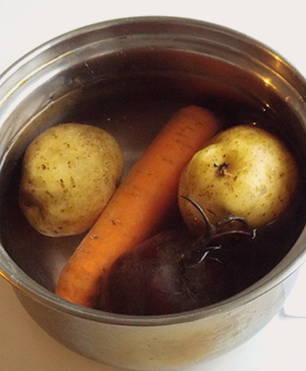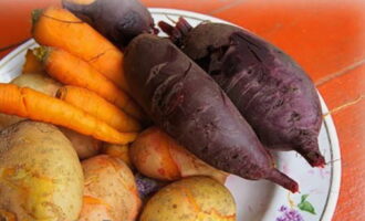 - Kook de bieten, aardappelen en wortelen tot ze gaar zijn. Koel en schil ze.