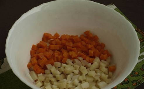 - Snijd de bieten, aardappelen en wortelen fijn.