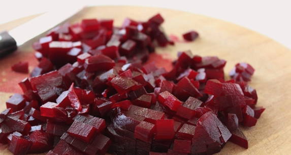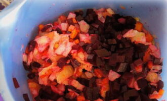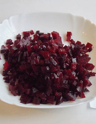 - Snijd de bieten in blokjes, overgiet met zonnebloemolie en roer.