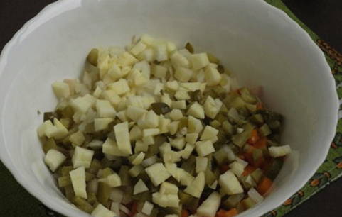 - Snijd gekookte aardappelen, ingelegde komkommers en wortelen op dezelfde manier.
