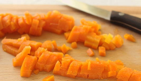 - Snijd ook de wortelen en aardappelen in blokjes.