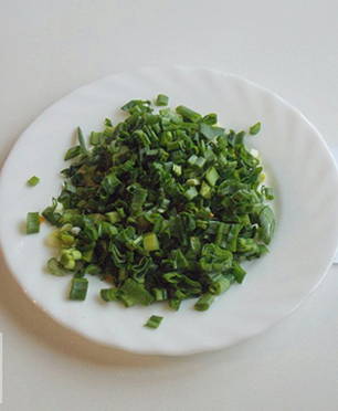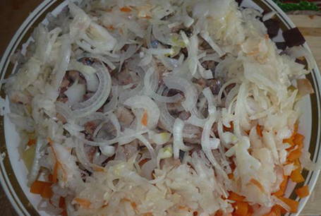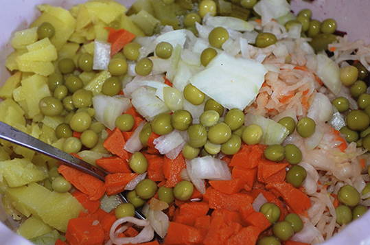 - Doe de groenten in een kom, voeg zuurkool en doperwten toe. Voeg gesnipperde uien toe.