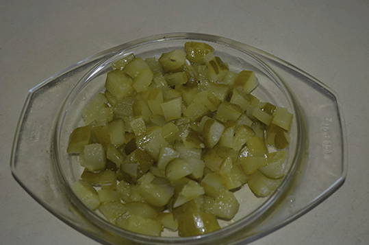 - Snijd de ingelegde komkommers in blokjes, giet de pekel af.