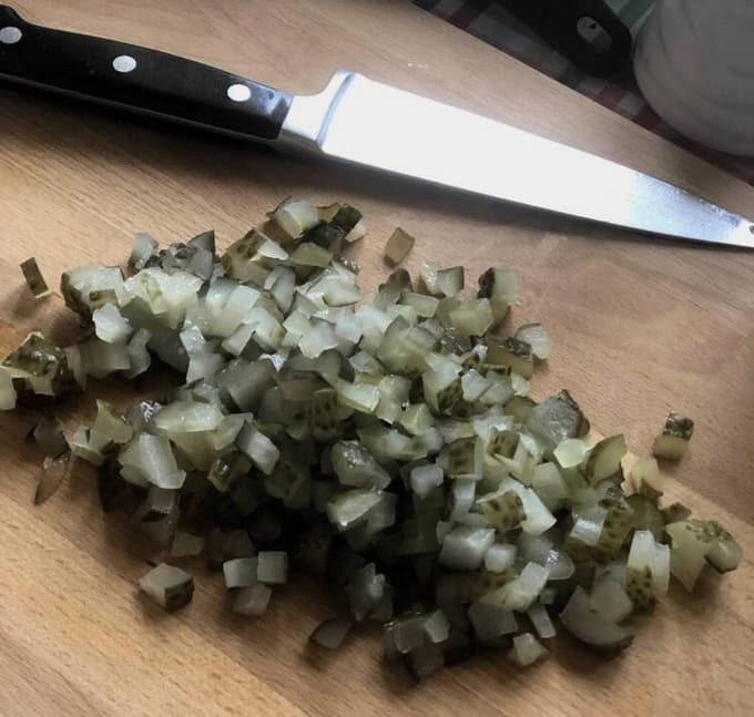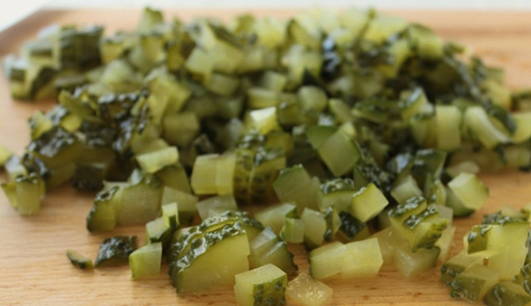 - Knijp de ingelegde komkommers uit de pekel en hak ze fijn.