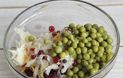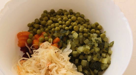 - Doe de groenten in een kom, voeg erwten uit blik en zuurkool toe.