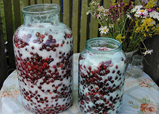 - Doe de bessen in voorbereide potten, bestrooi met suiker. Het is belangrijk om de integriteit van de bessen te behouden, zodat ze het sap eruit laten, maar hun vorm behouden.