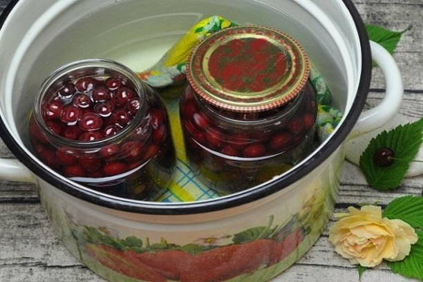 - Zet de containers met bessen in een pan en steriliseer gedurende 15 minuten met matig kokend water. Sluit de potten met kersen met voorbereide deksels, draai ze om en laat ze volledig afkoelen.