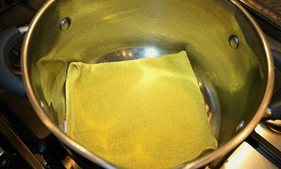 - Doe een handdoek in een grote pan, zet er potten met bessen op en giet er kokend water over zodat de hangers van de potten boven het kokende water blijven. Steriliseer containers met bessen gedurende ongeveer 15 minuten met medium kokend water.