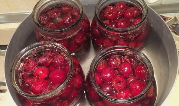- Zet de containers met kersen voor sterilisatie in een grote pan met kokend water en leg een handdoek op de bodem. De potten moeten zo worden geplaatst dat het kokende water de bovenkant van de kersencontainers niet bereikt. Steriliseer de potten met bessen ongeveer 20 minuten.