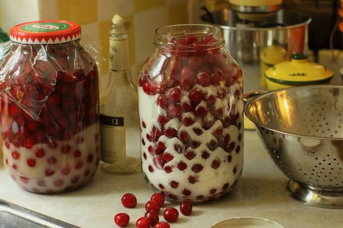 Doe ongeveer een handvol bessen in een geschikte gesteriliseerde container en bedek met een eetlepel suiker. Wissel kersen en suiker af tot de pot helemaal vol is. De laatste laag moet suiker zijn.