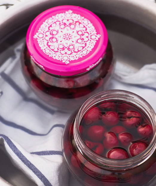 - Doe de kersen in potten en giet sap zodat er geen holtes zijn.