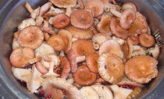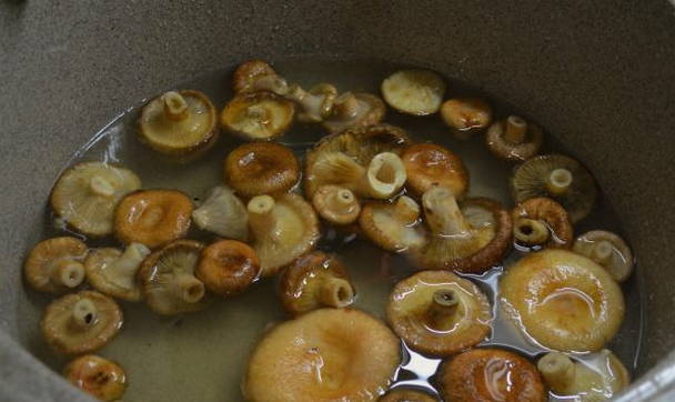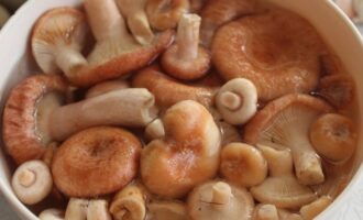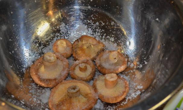 - We bereiden de golven voor: we maken ze schoon, verwijderen defecten en spoelen ze grondig af. Week drie dagen in koud water. Vergeet niet om de vijf tot zes uur het water te verversen. Na het weken het water afgieten en de champignons nogmaals goed afspoelen. We snijden grote exemplaren in stukken om alle golven ongeveer even groot te maken.