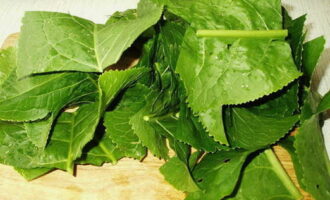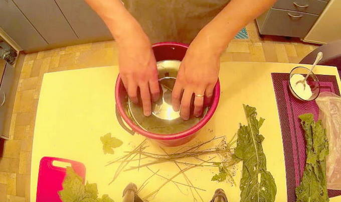 We wassen en steriliseren potten en deksels op alle mogelijke manieren. We wassen de mierikswortelbladeren en drogen ze op een handdoek.