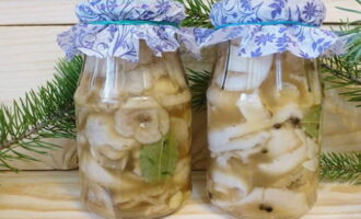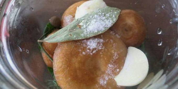 Giet het water van de geweekte champignons af. We leggen de golven in potten in lagen, besprenkeld met zout en verschuivend met laurierblaadjes en mierikswortelgroen. Het is uiterst belangrijk om grof steenzout te gebruiken voor het zouten. Met ondiep gejodeerd kan het resultaat onvoorspelbaar zijn. Verhit de plantaardige olie tot hij heet is en giet deze over de champignons in elke pot. De olie zorgt ervoor dat de lucht de paddenstoelen niet kan bereiken. We sluiten de potten met deksels en plaatsen de blanco in de koelkast om te zouten. Na twee maanden kun je de snack al proberen.